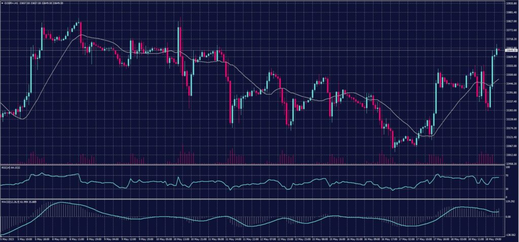 وارتفع مؤشر الداو جونز بنحو 0.34% أي ما يعادل 115 نقطة ليغلق فوق مستويات 33500 نقطة، كما ارتفع مؤشر S&P 500 بنسبة 0.9% محققاً أعلى إغلاق له في 9 أشهر.