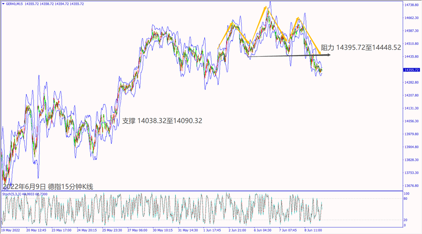 昨天(8日)欧美各国财长皆对通胀影响经济示警,造成欧美股指反转下跌。预期今天(9日)欧洲央行利率决议偏向鹰派,德指冲不过小时布林带上轨线14,435,建议可偏空操作。预期今天美国公布初请失业金人数攀升,道琼斯冲不过5日均线32,953,建议可短空操作。