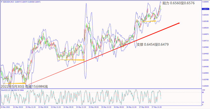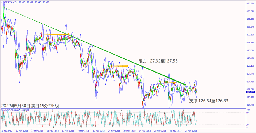 日级别线图,连续上涨突破盘涨顶部,守住114.00关口,有望延续涨势;15分钟K线,短线形成盘涨,守稳上升趋势线,大有可能挑战上方阻力。