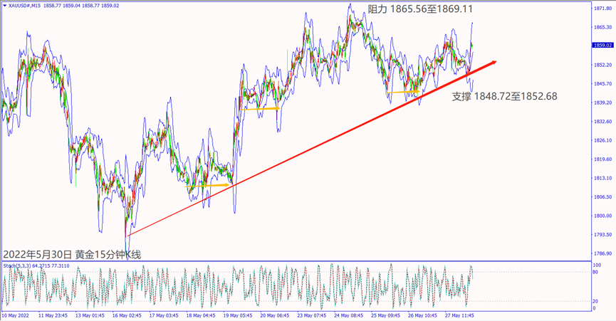 日级别线图,近期在1840~1870区间震荡,守住5日均线,可能挑战30日均线;15分钟K线,短线处于盘涨,守稳上升趋势线,大有可能挑战上方阻力。