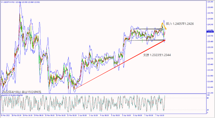 日级别线图,近两日在1.2400关口下方震荡,一旦跌破5日均线,可能转跌;15分钟K线,昨天出现假突破盘整顶部,盘整底部若掼破,大有可能下探支撑。