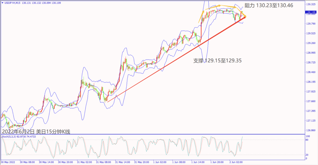 日级别线图,连续上涨触及5月起跌高点,一旦跌破130.00关口,可能回测5日均线;15分钟K线,出现圆形顶反转,上升趋势线若掼破,大有可能回测起涨支撑。