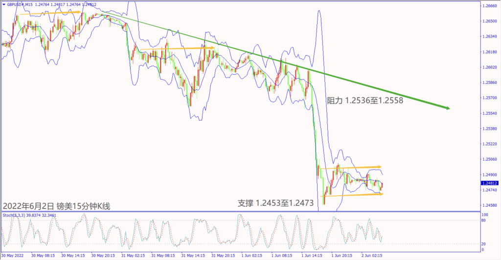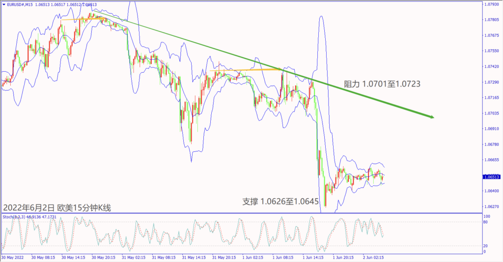 日级别线图,连续下跌回测盘整底部,守住1.0650,有机会反弹;15分钟K线,短线形成盘跌,一旦突破布林带上轨线,大有可能挑战下降趋势线。