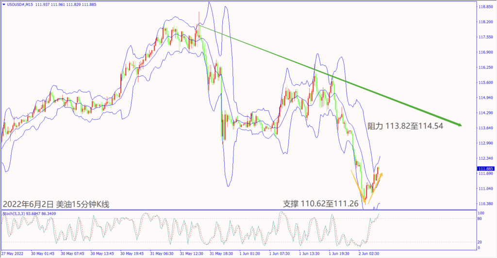 日级别线图,近期处于上升矩形,守住10日均线,不排除重回涨势;15分钟K线,出现V型反转,一旦突破112.00关口,大有可能挑战起跌阻力。
