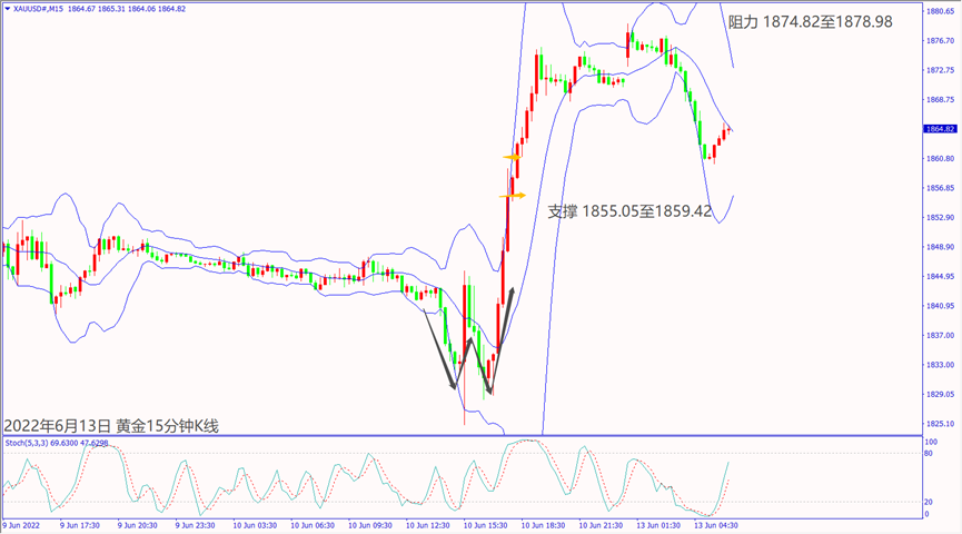 今天(13日)早上美债收益率和美元指数齐涨,造成黄金价格反转下跌近20美元。预期今天英国公布经济数据大都利好,一旦利好欧元和英镑上涨造成美元转跌,黄金价格若守住小时布林带下轨线1860关口,建议可短多操作。
