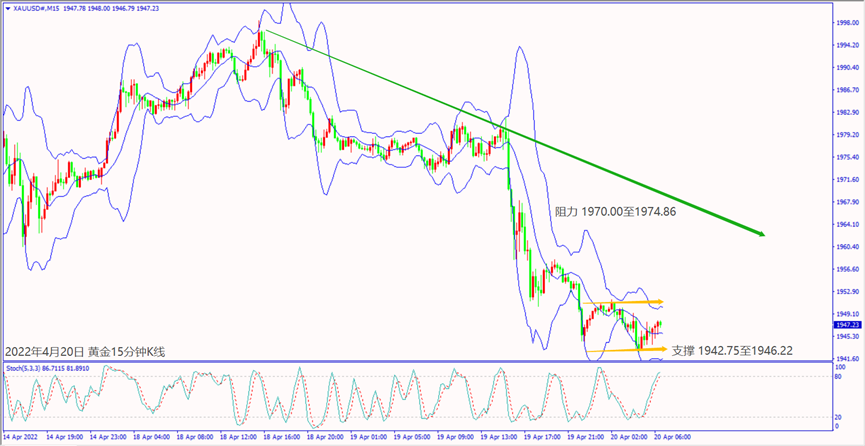 昨天(19日)欧美国债收益率大幅度攀升,带动欧美股指出现大涨走势,也让避险资金造成黄金从高点大跌近40美元。预期今天(20日)欧洲央行公布欧元区经济调查调降GDP增长,一旦欧美股指出现大跌,黄金价格突破小时布林带中轨1950美元,建议可短多操作。