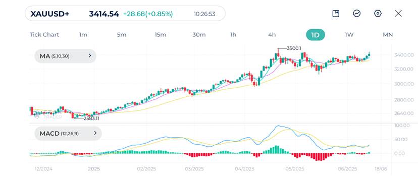 中东地区的地缘政治动荡推高了金价。在以色列对伊朗发动空袭后,避险需求骤增,金价飙升至每盎司3423美元,创下自5月初以来的最高水平。与此同时,美国通胀数据低迷及就业市场降温也为贵金属价格提供了支撑。
