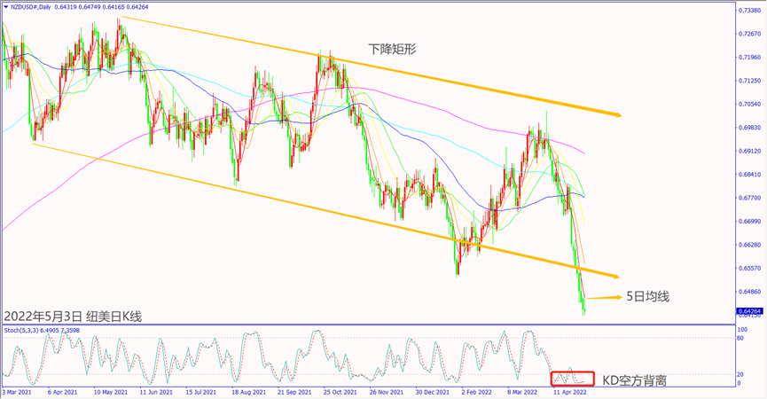 日級別線圖,連續下跌KD空方背離,一旦突破5日均線,可能出現反彈。