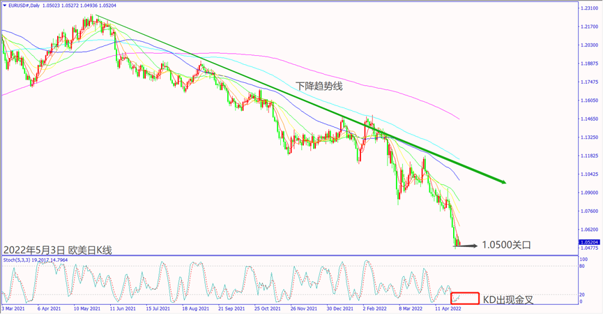 日級別線圖,近三日守在1.0500關口附近盤整,KD出現金叉,可能出現反彈。