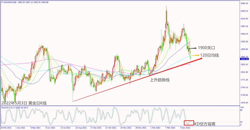 日級別線圖,連續下跌KD空方背離,守住上升趨勢線,可能挑戰1900美元。