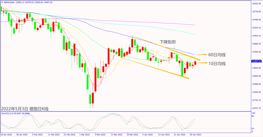 日級別線圖,近期出現下降矩形,沖不過10日均線,可能下探新低。