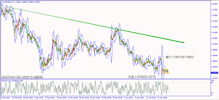 上週五(15日)為耶穌受難日假期美元指數沒有報價。受到上週四(14日)歐洲央行利率決議對俄烏戰爭衝擊經濟提出示警,亞洲市場仍拋售歐元和英鎊,造成歐美和鎊美出現回調。美聯儲哈克預計美國經濟增速放緩,一度帶動歐美和鎊美皆漲逾25個點。晚間美國公佈經濟數據利好,帶動美加上漲約25個點,也讓歐美和鎊美維持在當天高低點間震盪。
