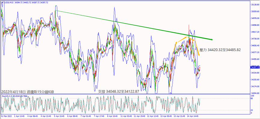 今天(18日)清晨烏克蘭總統澤連斯基表示準備好抗戰10年,也讓道瓊斯和納指皆下跌逾150個點。預期美國公佈新冠疫情持續攀升,道瓊斯一旦跌破60日均線34,366,建議可偏空操作。今天納指開盤後摜破上週盤整低點,短線震盪沖不過小時布林帶中軌13,825,建議可偏空操作。