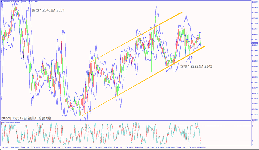 日級別線圖,近期在1.2300附近盤整,守住5日均線,有望上看240日均線;15分鐘K線,出現上升楔形,守穩趨勢線,有機會挑戰前高壓力。