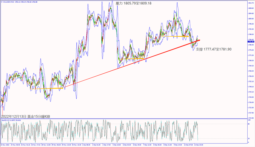 日級別線圖,近期在240日均線下方震盪,一旦突破5日均線,可能上看1810美元;15分鐘K線,短線處於盤漲,守住上升趨勢線,不排除挑戰上方壓力。