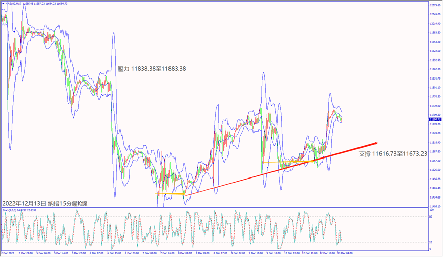 昨天(12日)美國財長耶倫表示未來一年通脹將大幅下降,市場樂觀美聯儲加息逐步趨緩,帶動道瓊斯和納指擴大上漲超1%。預期今天(13日)歐元區經濟景氣指數不佳,德指若跌破5日均線14,314,建議可短空操作。預期今天美國公佈CPI年率下降利好股指,納指若守住小時布林帶中軌11,671,建議可短多操作。
