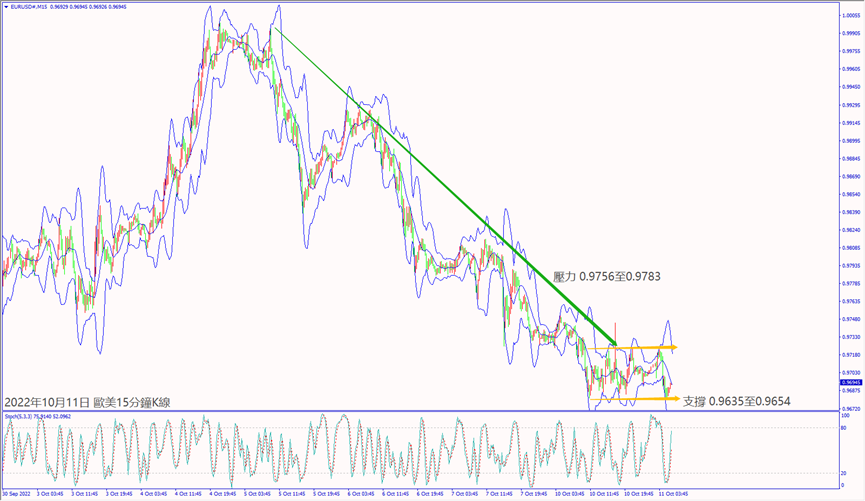 日級別線圖,連續下跌KD空方背離,守住0.9650,有機會出現反彈;15分鐘K線,短線區間震盪,一旦突破下降趨勢線,大有可能挑戰前高壓力。