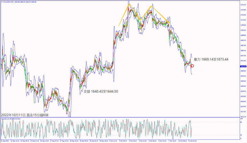 昨天(10日)受到美元和美債收益率齊漲影響,造成黃金價格從當日高點下跌約35美元,尾盤守在1665美元上方整理。預期今天(11日)英國公佈經濟數據不佳利淡歐元和利好美元,黃金價格若跌破小時布林帶下軌線1663美元,建議可短空操作。