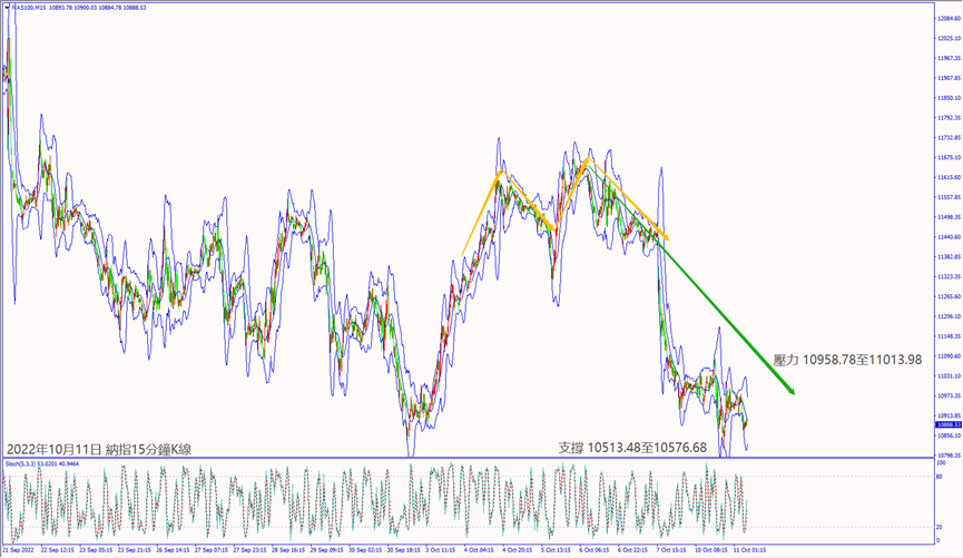昨天(10日)美聯儲官員預期將在2023年加息至4.5%,造成道瓊斯和納指反轉下跌超200點。預期今天(11日)英國公佈失業數據攀升恐利淡歐洲股指,德指沖不過小時布林帶中軌12,274,建議可短空操作。預期今天美聯儲官員重申加息抑制通脹,納指一旦跌破小時布林帶下軌線10,824,建議可短空操作。