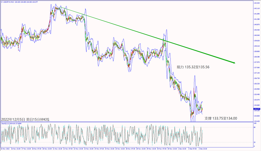 日級別線圖,連續下跌KD空方背離,守住134.00關口,可能出現反彈;15分鐘K線,短線形成盤跌,布林軌道中軌若突破,有機會上看下降趨勢線。