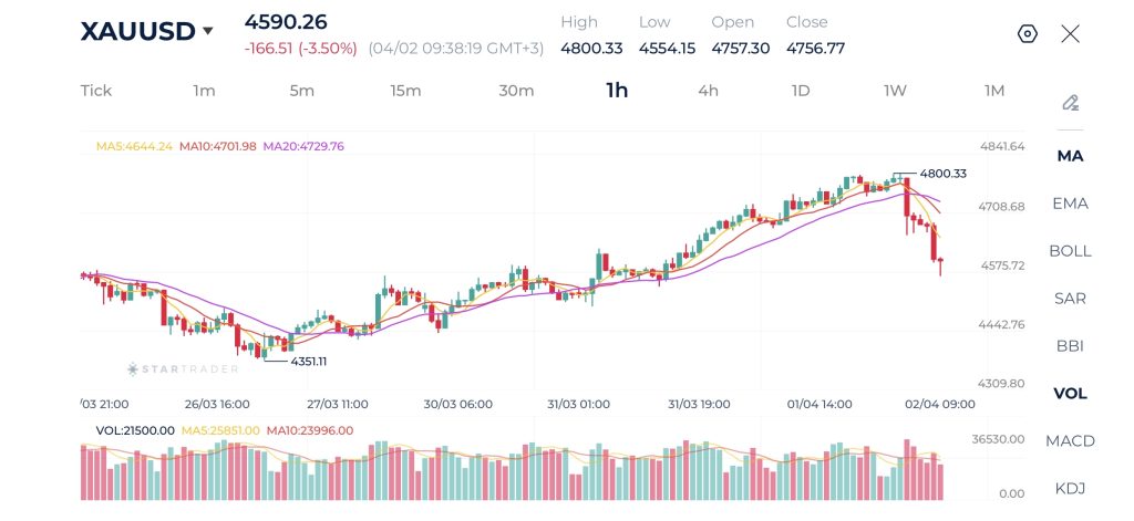 Vàng đang giao dịch quanh mức $4,590 và vừa trải qua một đợt đảo chiều giảm giá mạnh trên khung thời gian 1 giờ sau khi thất bại trong việc duy trì đà tăng gần vùng kháng cự $4,800.