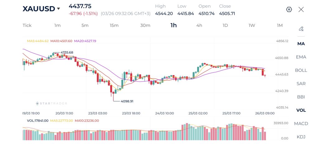 Vàng hiện đang giao dịch gần mức $4.440 và đang phải đối mặt với áp lực giảm giá trở lại sau khi không thể duy trì đà hồi phục gần đây. Cấu trúc tổng thể đã chuyển sang xu hướng giảm, với việc giá hình thành các mức đỉnh thấp dần (lower highs) và bắt đầu dao động dưới các đường trung bình động (MA) quan trọng.