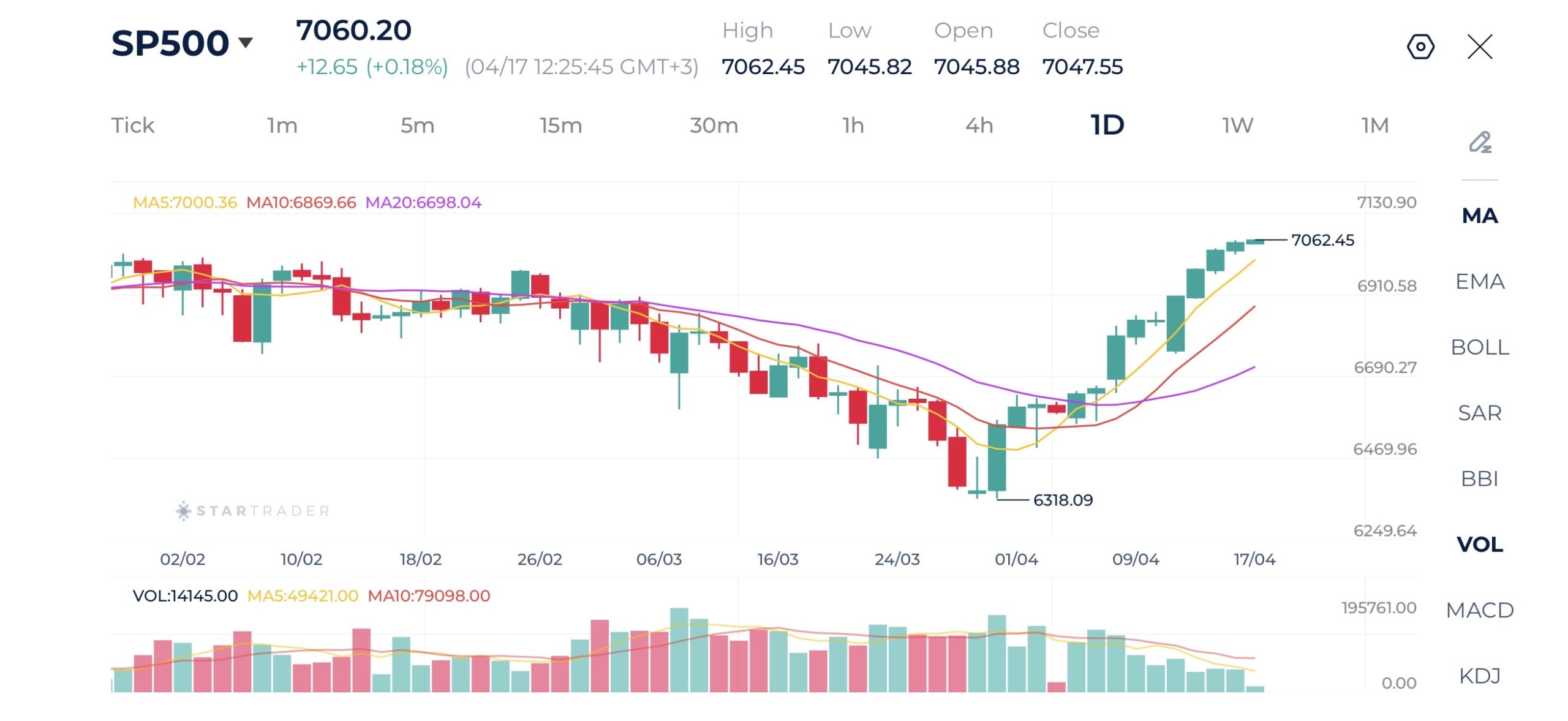 Chỉ số S&P 500 đã thực hiện một cú đảo chiều tăng giá mạnh mẽ từ mức đáy 6.318 và hiện đang giao dịch gần mức đỉnh 7.062 vừa thiết lập. Giá đang nằm cao hơn hẳn so với các đường MA5, MA10 và MA20; các đường trung bình động này đang xếp chồng lên nhau theo hướng tích cực và động lượng rõ ràng đang nghiêng về phía phe mua. Sự phục hồi sắc nét này cho thấy khẩu vị rủi ro đang rất mạnh và nhu cầu từ các tổ chức vẫn tiếp tục duy trì.