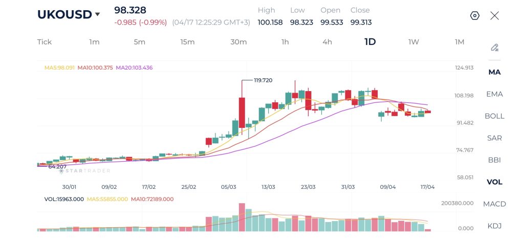 Dầu thô Brent đang trải qua một đợt thoái lui sâu hơn sau khi tăng lên mức đỉnh gần đây. Giá hiện đã rơi về vùng $98.30, giao dịch dưới các đường trung bình động MA5 và MA10, trong khi đường MA20 quanh mức $103.43 đang đóng vai trò là mức kháng cự. Thiết lập này cho thấy đà tăng giá đã hạ nhiệt và thị trường hiện đang trong chế độ điều chỉnh.