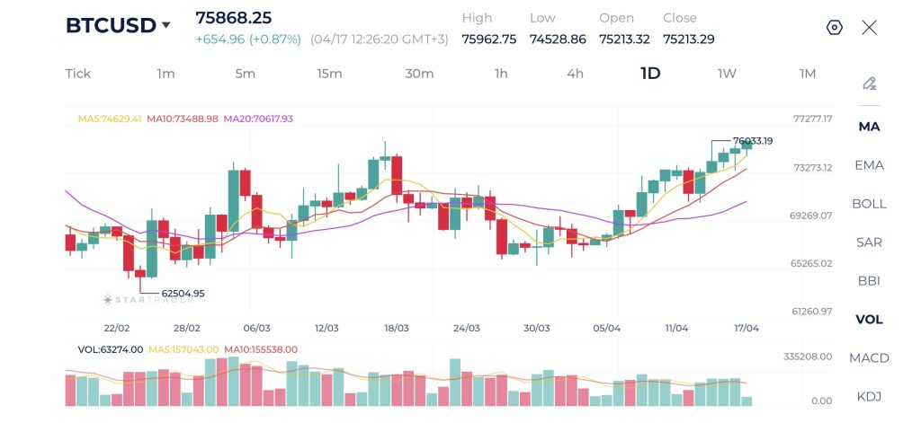 Bitcoin tiếp tục cho thấy động lượng tăng trưởng mạnh mẽ trên khung thời gian ngày sau khi hồi phục từ mức đáy $62.504 và tiến về mức đỉnh $76.033 gần đây. Giá đang giao dịch vững chắc trên các đường MA5, MA10 và MA20; tất cả các đường trung bình động đều đang hướng lên, xác nhận một xu hướng tăng giá lành mạnh. Chuỗi các đỉnh cao hơn và đáy cao hơn (higher highs and higher lows) gần đây cho thấy phe mua vẫn đang kiểm soát hoàn toàn và nhu cầu mua khi giá điều chỉnh vẫn rất mạnh mẽ.