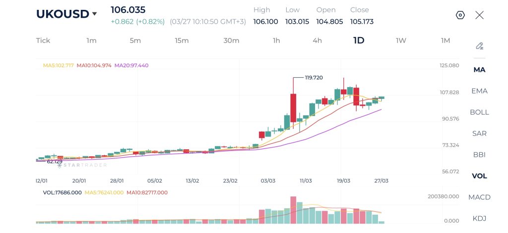 Dầu đang giao dịch quanh mức 106.00 USD và tiếp tục cho thấy động lực tăng mạnh trên khung thời gian hàng ngày sau một đợt tăng kéo dài từ các mức thấp trước đó.