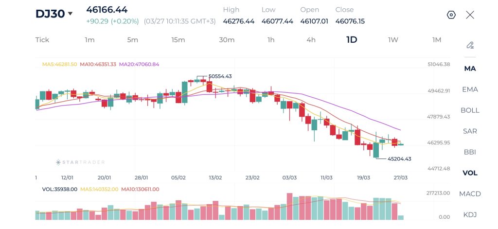 Dow Jones đang giao dịch gần mức 46,166 và vẫn chịu áp lực trên khung thời gian hàng ngày. Mặc dù có dấu hiệu ổn định ngắn hạn sau khi bật lên từ vùng 45,200, nhưng đà hồi phục này mang tính điều chỉnh.